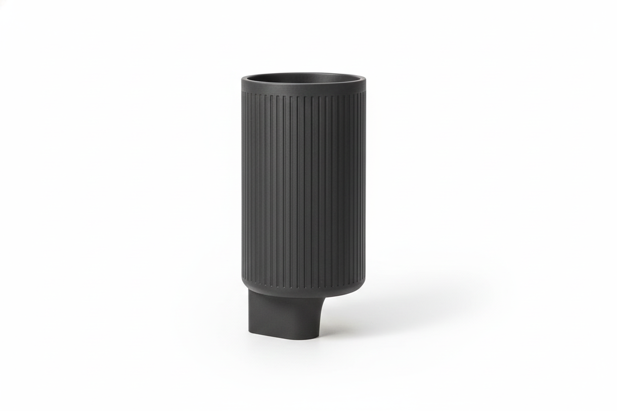 Een geraffineerde look gecombineerd met moderne materialen. De bak bestaat uit één geheel uit glasvezel versterkt beton en op 18cm hoogte van de ondergrond begint een overstek van 18cm ten opzichte van de basis van 26cm. De verticale accent groeven die rondom zijn aangebracht zijn een visuele en praktische bonus. Pamfletten en stickers aanbrengen wordt hierdoor een stuk lastiger.