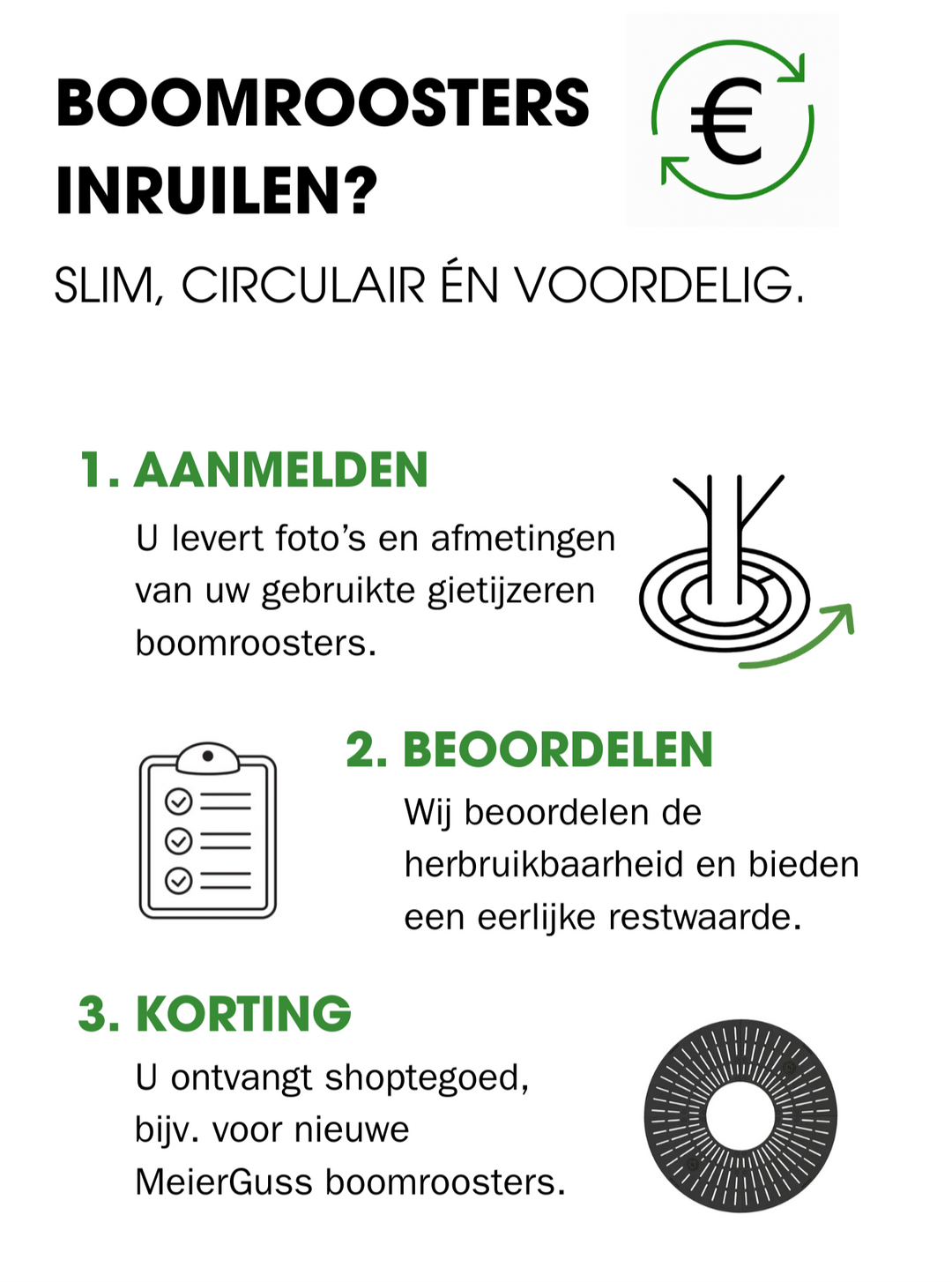 - ✅ Bij directe vervanging door MeierGuss-boomroosters ontvangt u bovendien extra korting.